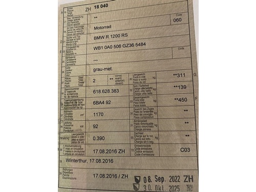 BMW R 1200 RS. Leistung: 125PS. 125 Newtonmeter. Inverkehrsetzung 17.8.2016. Kilometerstand 21`545km. Grau-metallisiert. Inklusive Zubehör Top-Case. 2 Plätze. Leergewicht: 311kg. Pneus eine Saison alt.; ; Motorfahrzeugkontrolle mit Service per November 2025 erfolgreich erfolgt.; ; Sehr guter Zustand, jedoch mit einzelnen Kratzern und Gebrauchsspuren. Frontscheibe teilweise matt.; ; Besichtigung jederzeit möglich nach Voranmeldung.; ; Befindet sich in Nähe von Winterthur.; ; Bezahlung vor oder bei Abholung.; ; Kauf ab Platz, das heisst ohne weitere Garantie. Nutzen und Gefahr gehen mit Bezahlung über.; ; Bei Fragen bzw. für Termine 079 671 28 48.; ; Mfg, A. Gerber.; BL