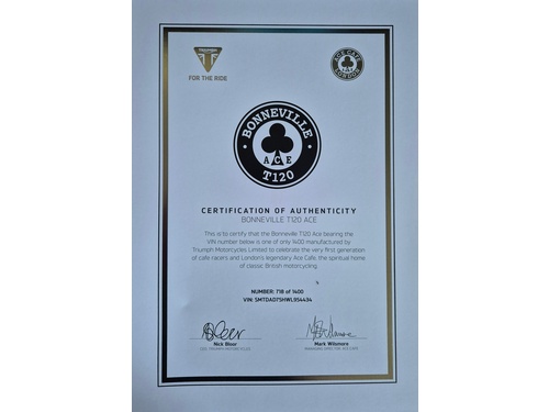 Triumph Bonneville T120 Ace – klassischer Stil, pures Fahrgefühl; Zum Verkauf steht eine wunderschöne Triumph Bonneville T120 Ace Limited Edition im Originalzustand – eine stilvolle Hommage an die legendäre Café-Racer-Szene des Ace Café London. Dieses Sondermodell verbindet zeitlosen britischen Charakter mit moderner Technik und einem kraftvollen 1200-ccm-Motor.; ; Die Maschine befindet sich in Topzustand, wurde regelmässig und sorgfältig gewartet und ist sofort bereit für die kommende Saison. Einfach aufsteigen und den Frühling geniessen!; ; Der drehmomentstarke Parallel-Twin sorgt für ein sattes, lineares Fahrgefühl, während das klassische Fahrwerk und die entspannte Sitzposition jede Ausfahrt ob alleine oder zu zweit zu einem besonderen Erlebnis machen – egal ob auf kurvigen Landstrassen oder beim gemütlichen Cruisen.; ; Die Ace-Sonderedition überzeugt mit ihrer markanten schwarz-matten Optik, hochwertigen Details und der typischen Bonneville-Silhouette, die seit Jahrzehnten Motorradgeschichte schreibt.; ; Ein Motorrad für alle, die echten Charakter, Stil und Fahrspass suchen.; ; Bereit für viele unvergessliche Kilometer – einsteigen, starten und geniessen!; BL
